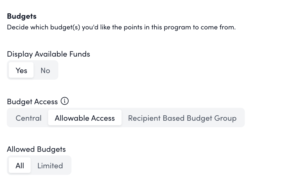 In the Points section of the Recognition Program settings, adjust the Budget Access settings to either: